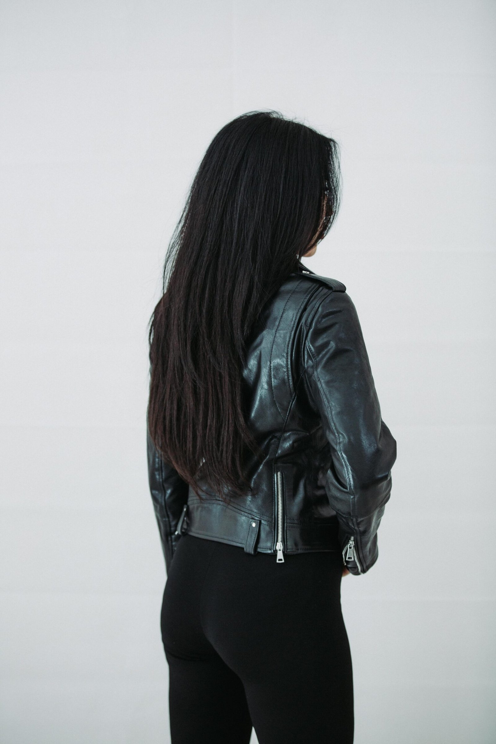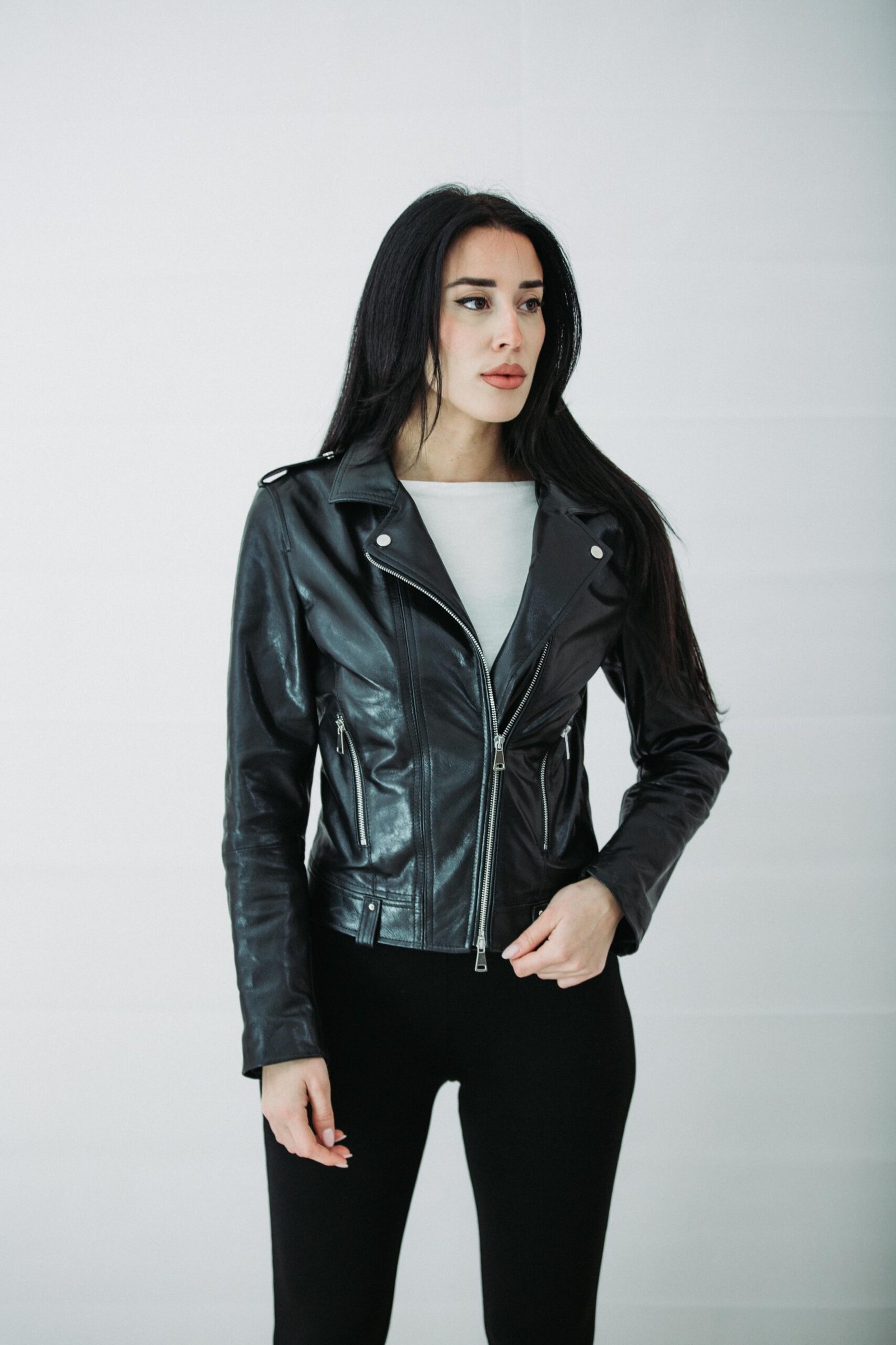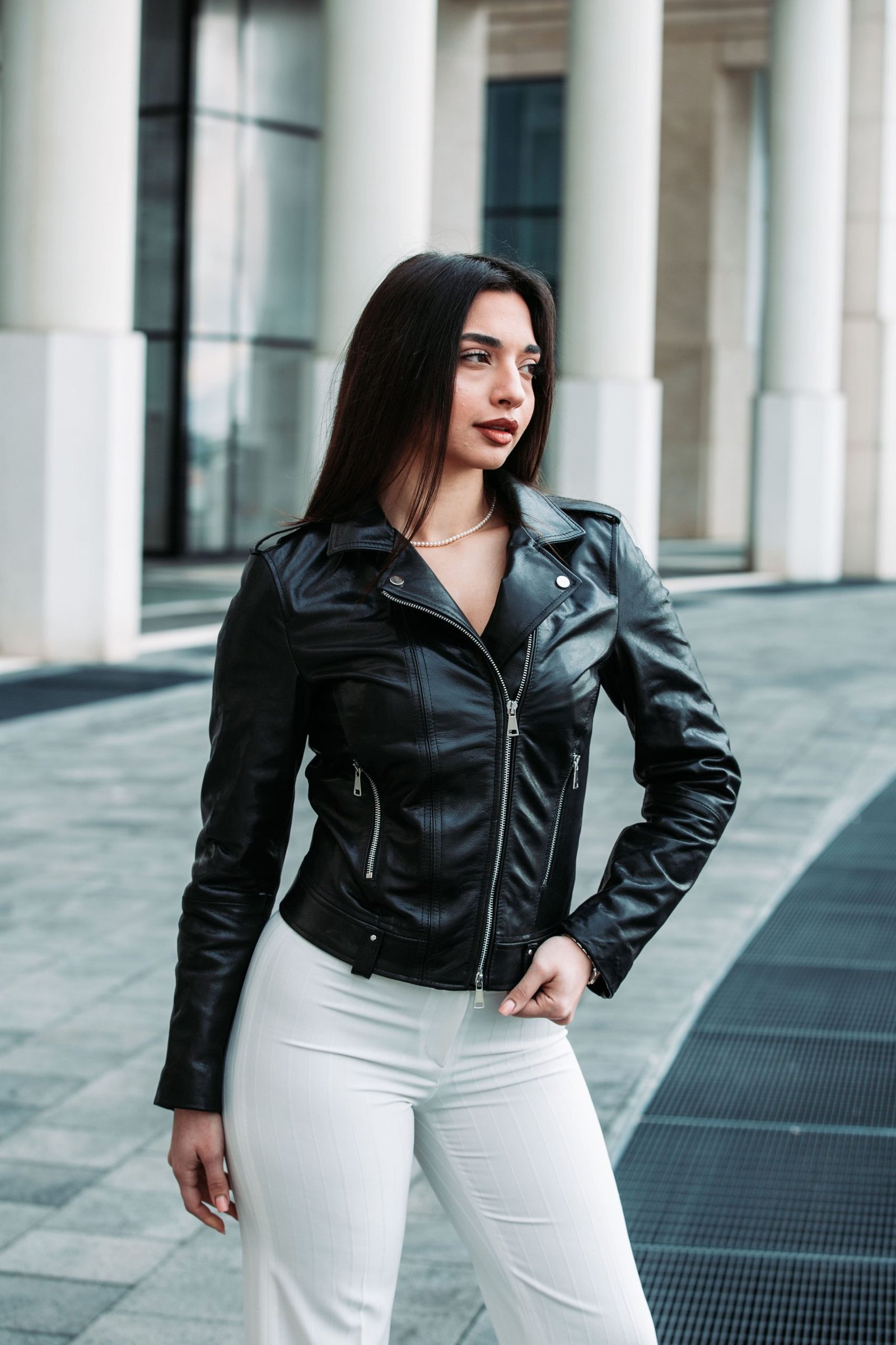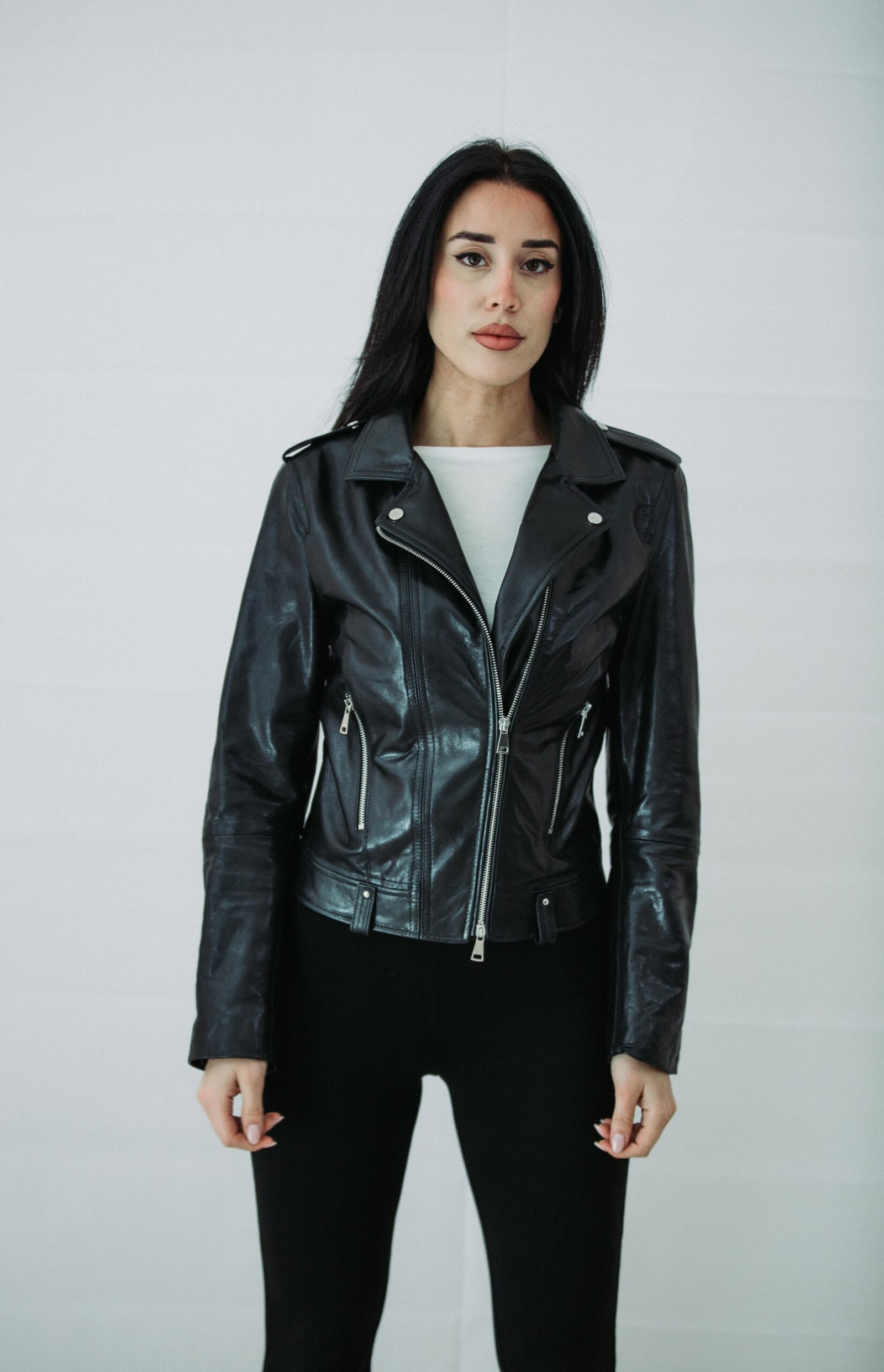 Eleganza senza tempo e stile deciso si fondono nella giacca in pelle modello Asia. Realizzata in vera pelle nera dalla finitura liscia e lussuosa, Asia è una giacca dal design moderno e sofisticato. Il taglio dritto con lunghezza sopra ai fianchi la rende estremamente versatile, perfetta sia per outfit casual che per abbinamenti più ricercati. Il colletto classico, la zip frontale in metallo e le tasche con chiusura zip aggiungono dettagli di carattere.