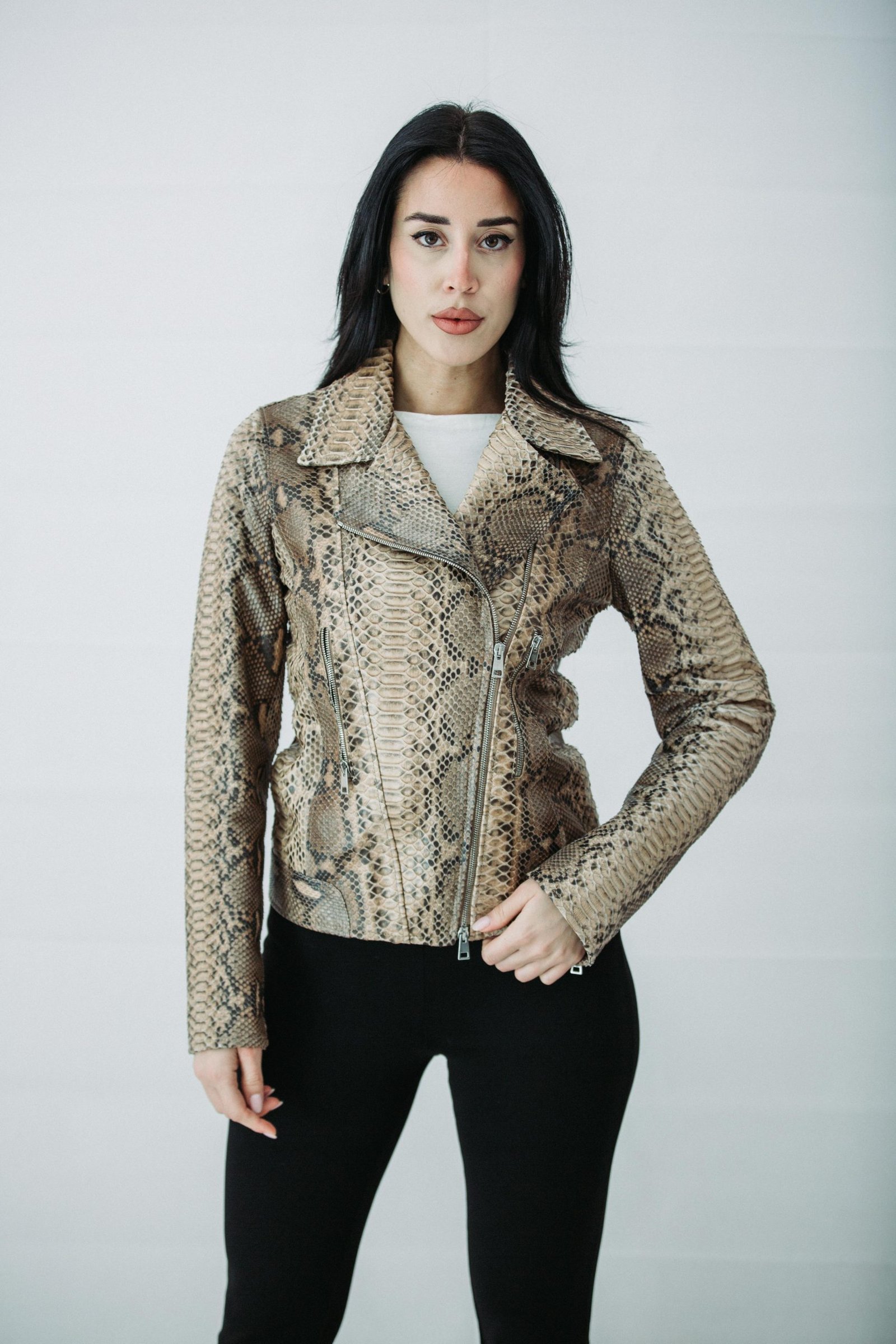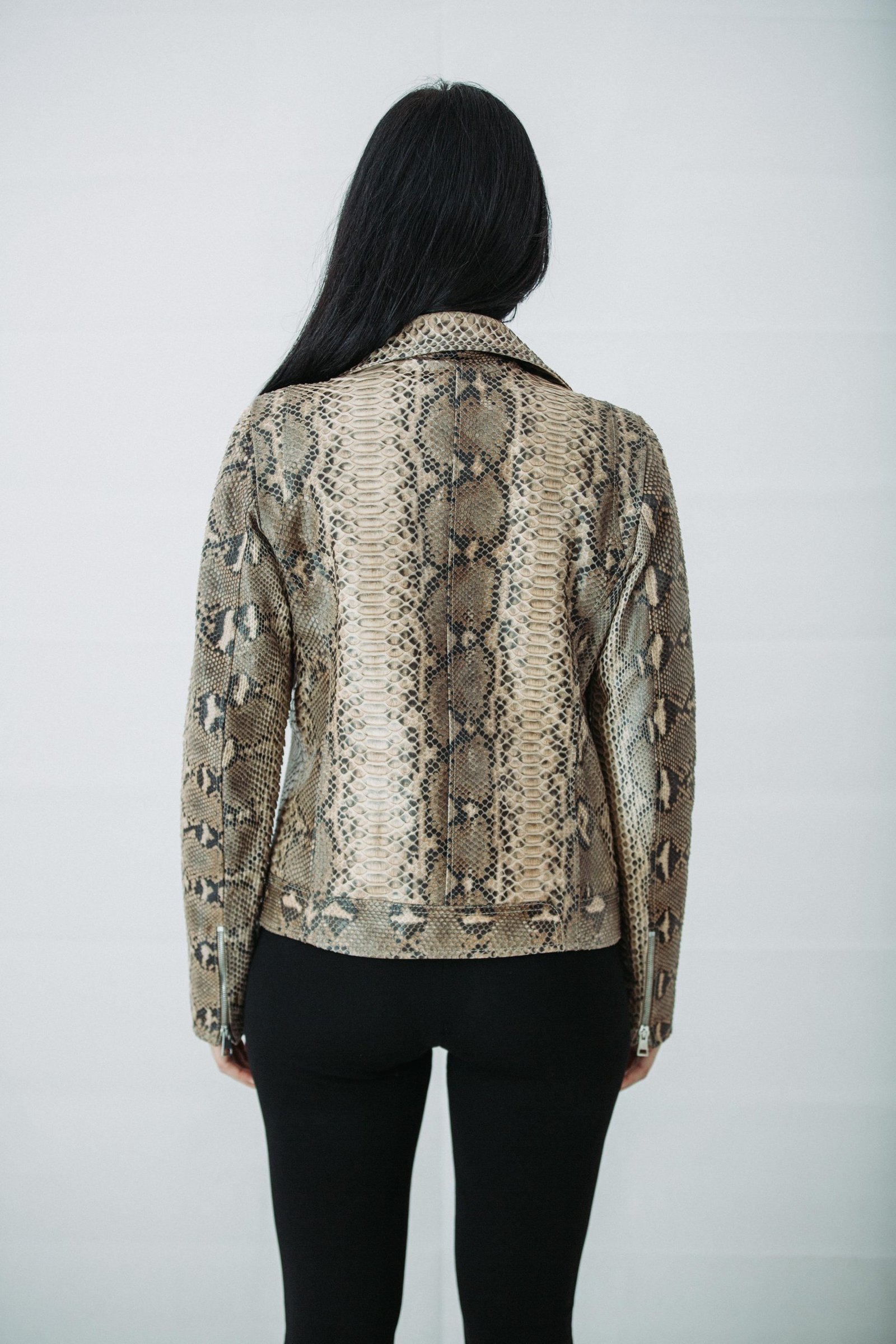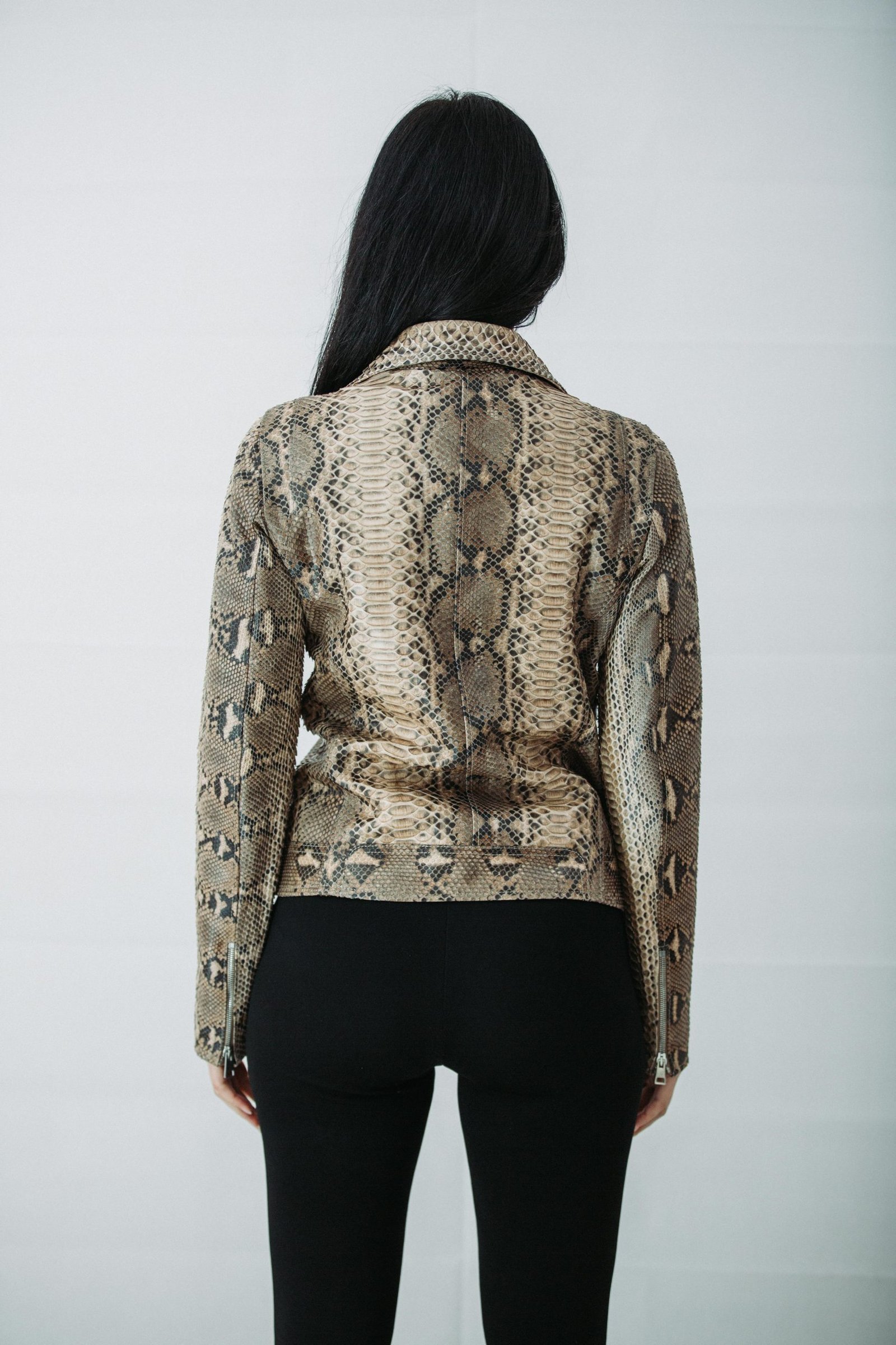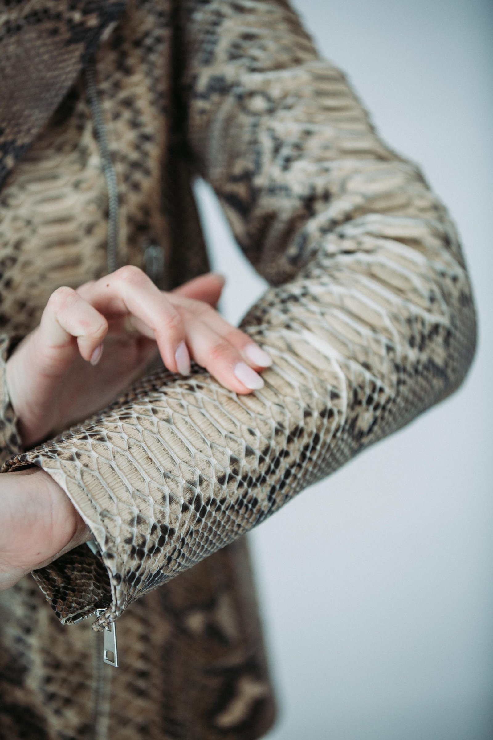 Un’icona di stile ribelle incontra il lusso esotico. Questo chiodo in vero pitone naturale è un capo senza compromessi, pensato per chi vuole distinguersi con carattere e raffinatezza. Realizzato artigianalmente, ogni giacca è un pezzo unico, con la tipica texture a scaglie che rende inconfondibile la pelle di pitone.