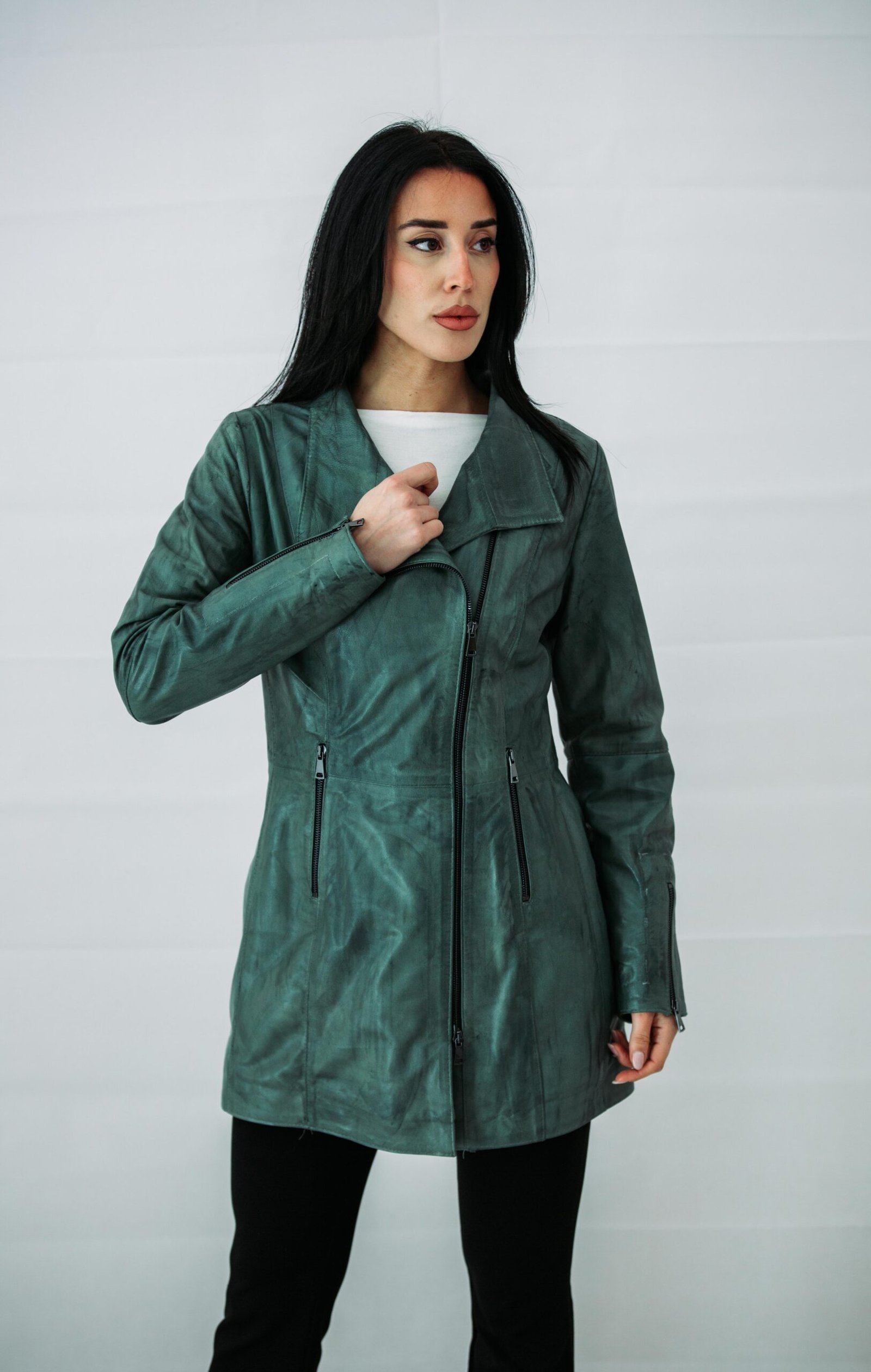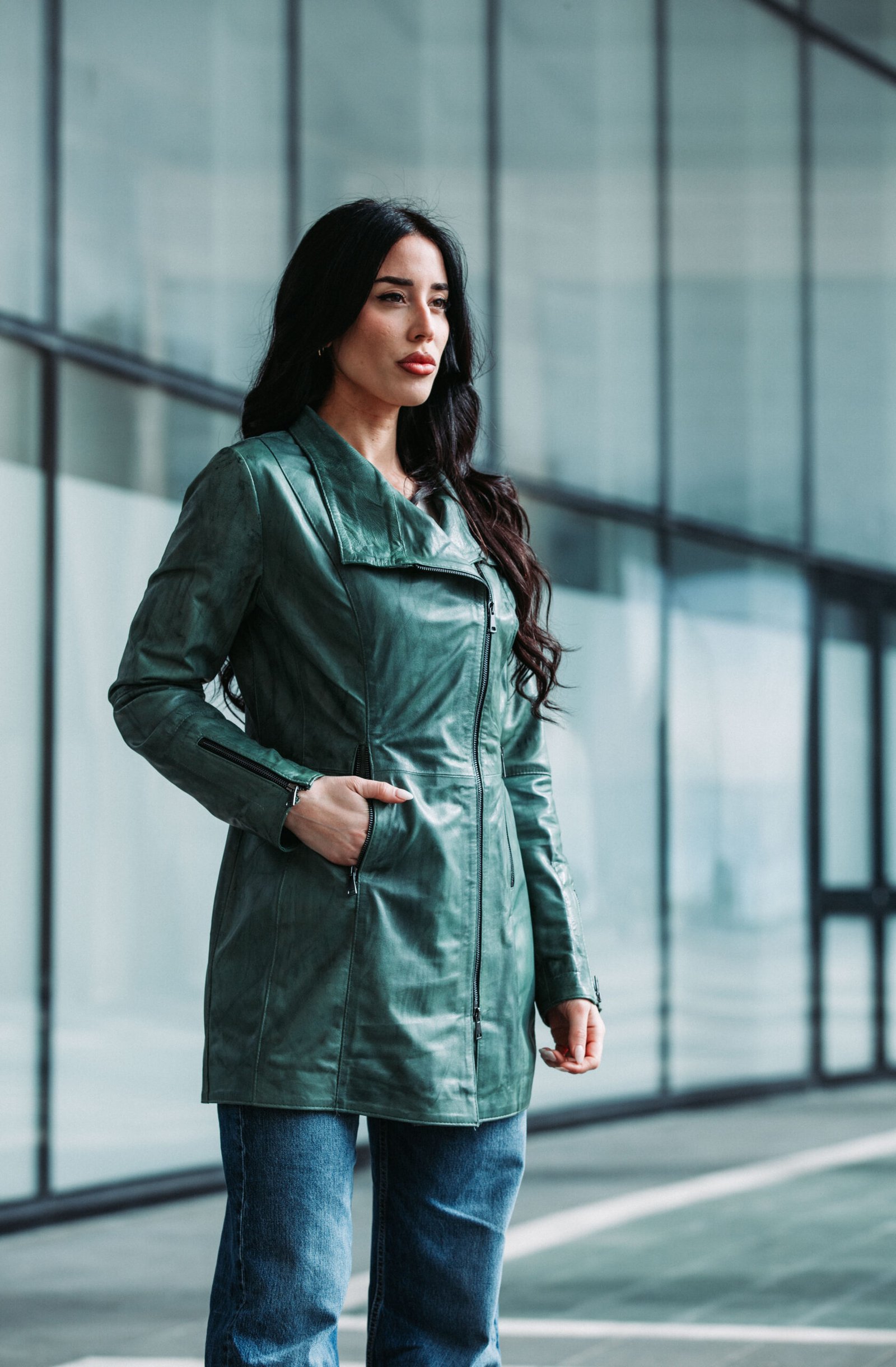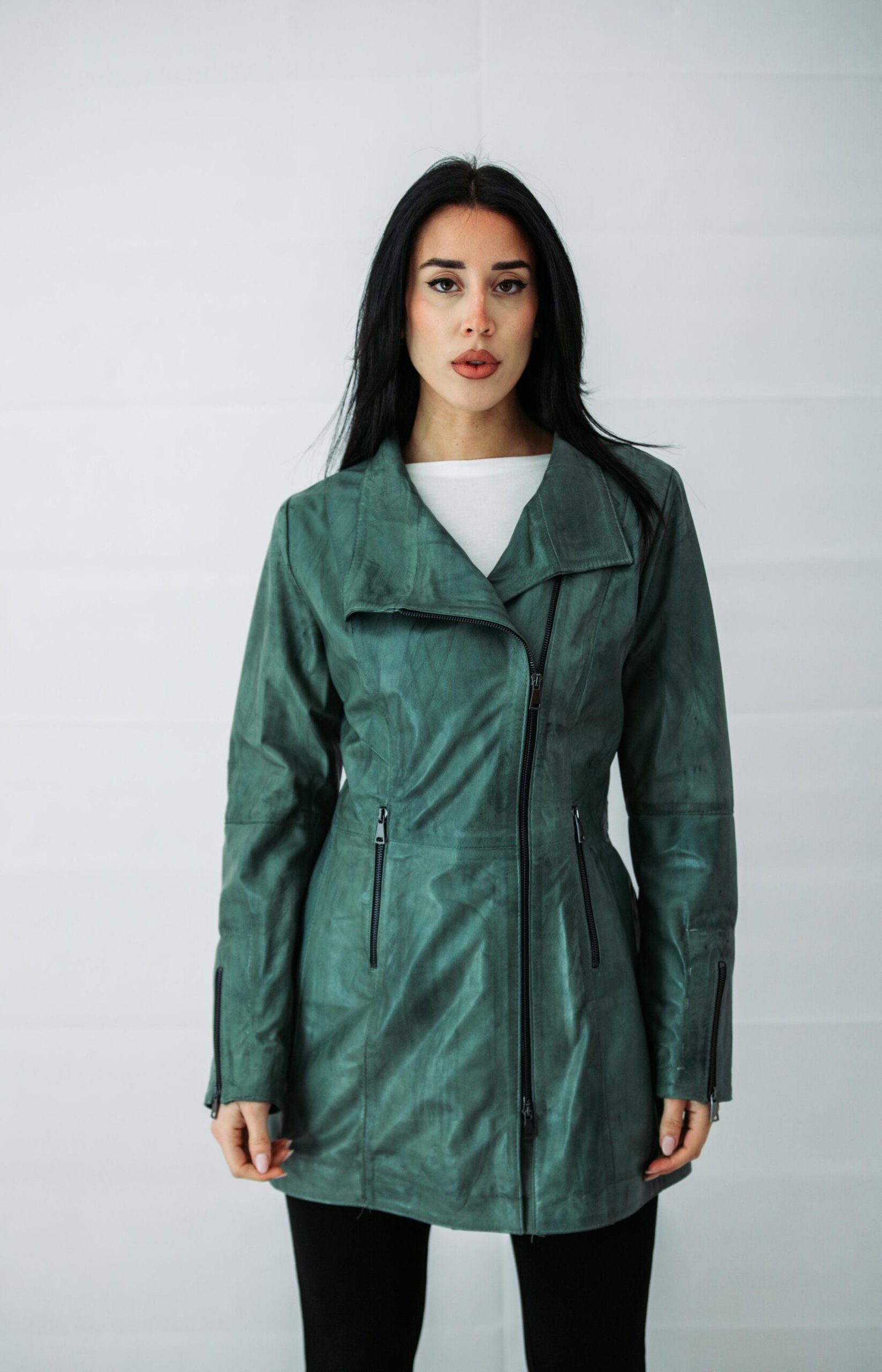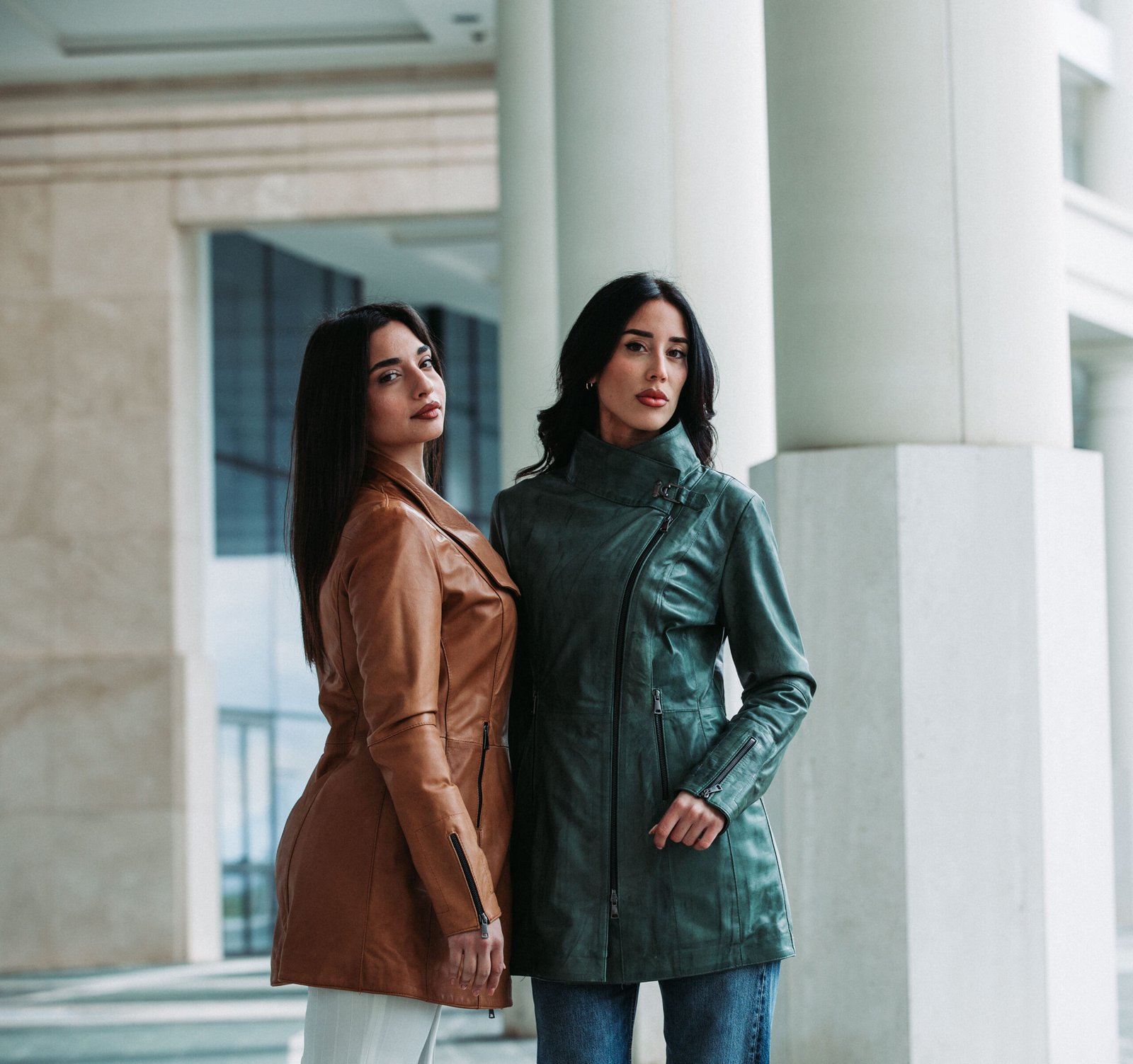 Disponibile in due tonalità sofisticate – cuoio e verde smerigliato – offre una vestibilità strutturata che esalta la silhouette con raffinatezza.