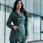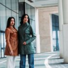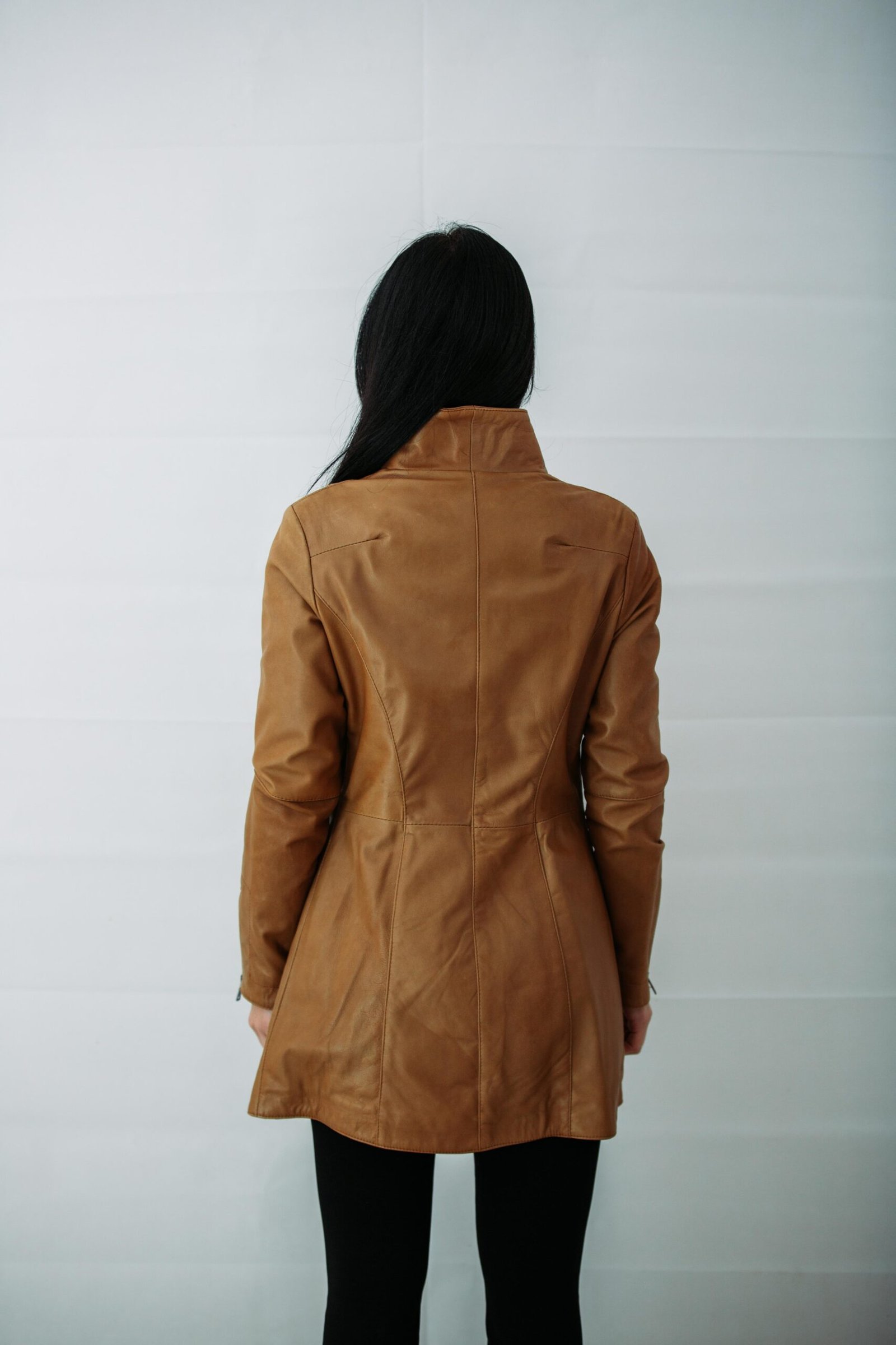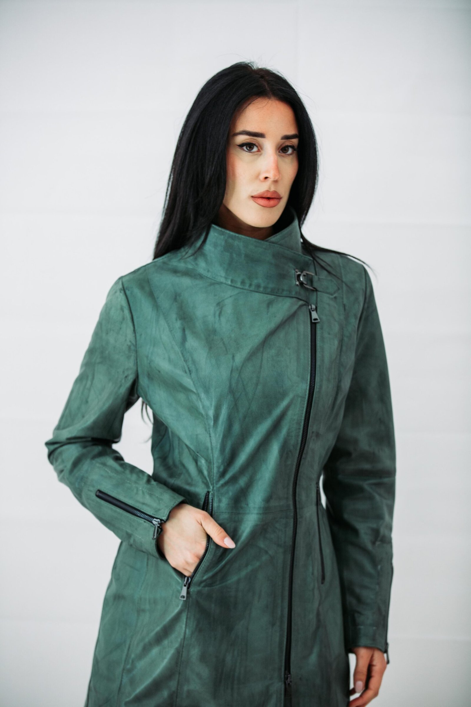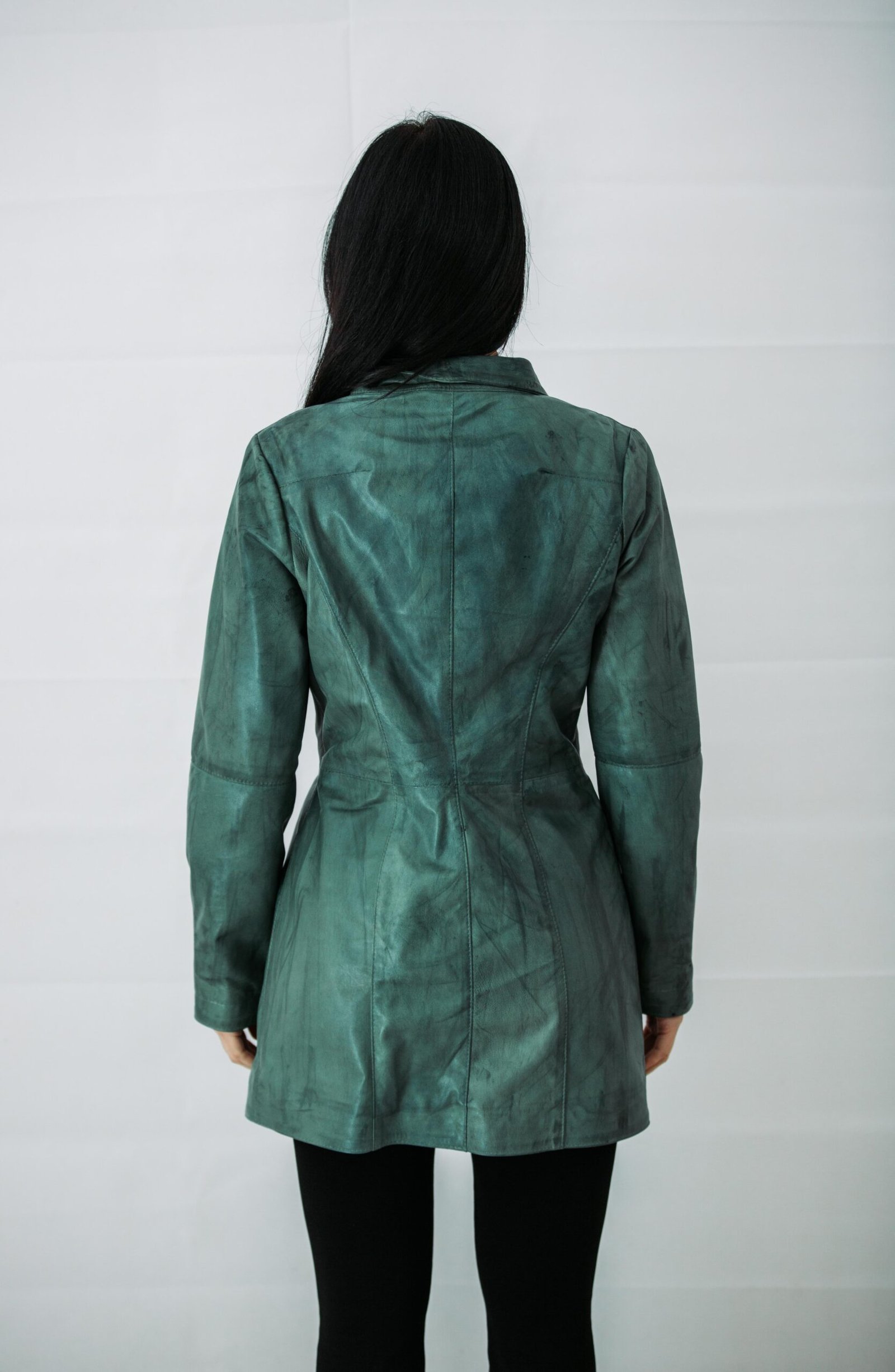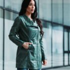 Disponibile in due tonalità sofisticate – cuoio e verde smerigliato – offre una vestibilità strutturata che esalta la silhouette con raffinatezza.