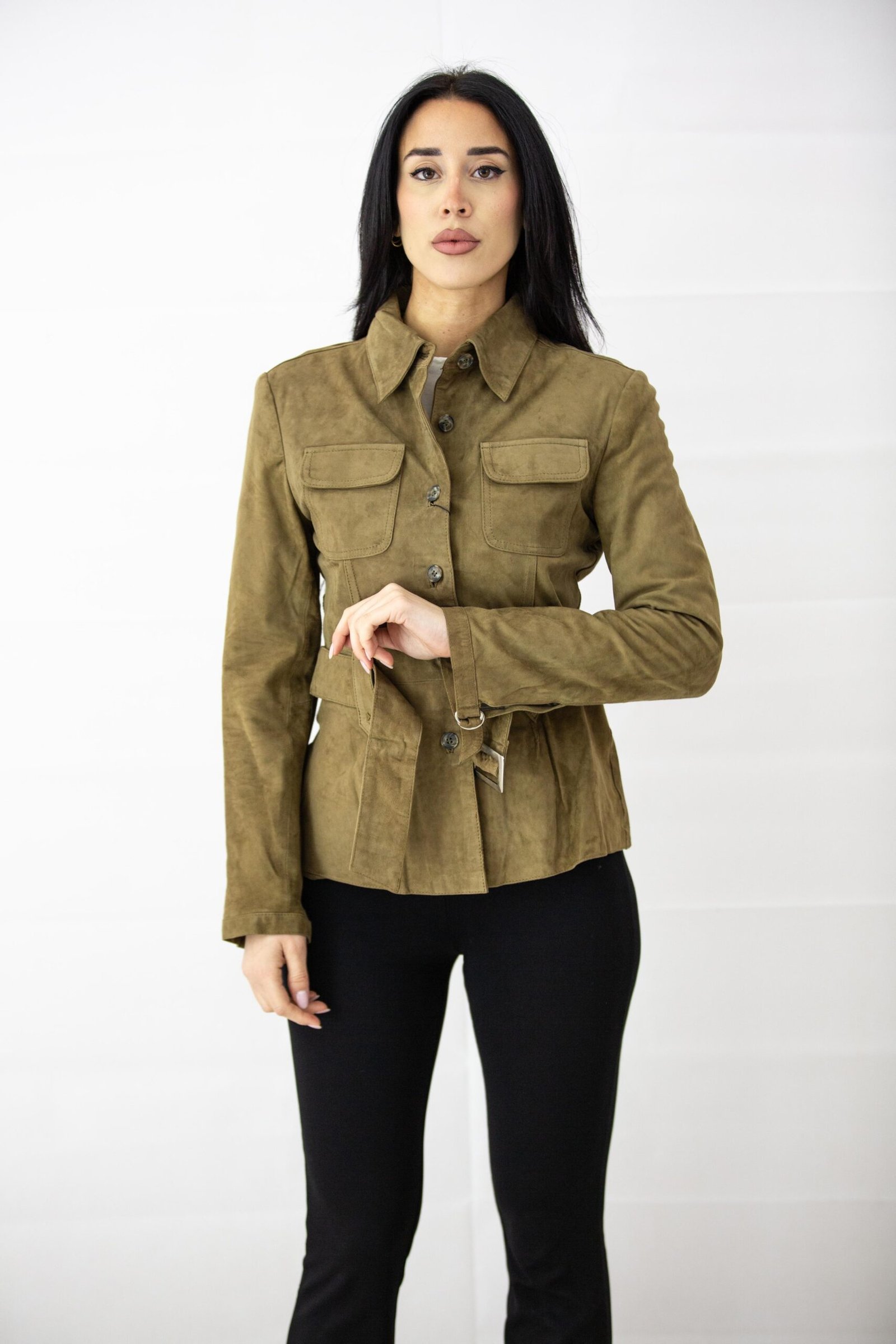 Scopri il fascino intramontabile di questa giacca sahariana in suede, perfetta per aggiungere un tocco sofisticato e deciso al tuo guardaroba. Realizzata in morbida pelle scamosciata di alta qualità, presenta una struttura sartoriale con una silhouette femminile e definita.